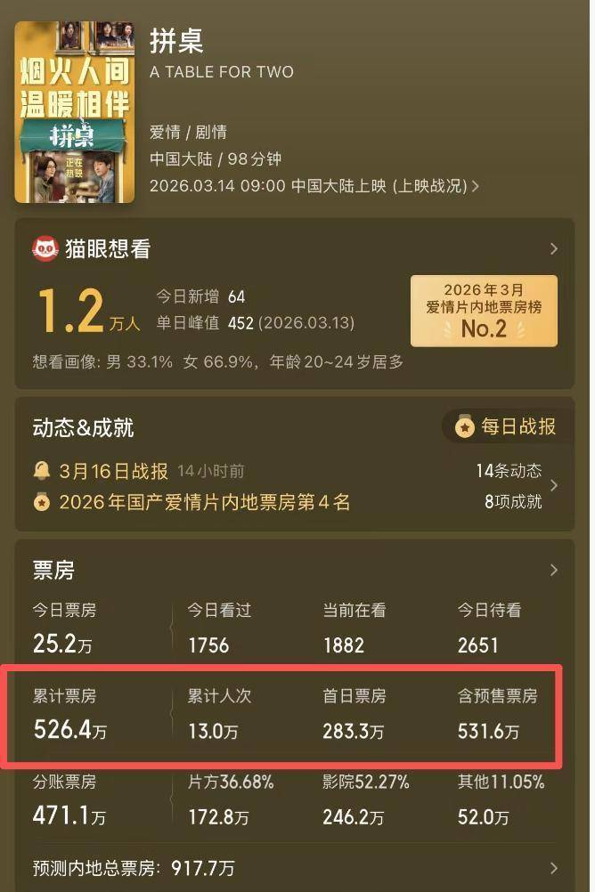 然而,在2026年伊始,“连爆三部电影”的王传君却遭遇重创,他主演的电影《拼桌》一上映便扑街。上映四天仅收获526万票房,甚至不及同期电影票房的零头。