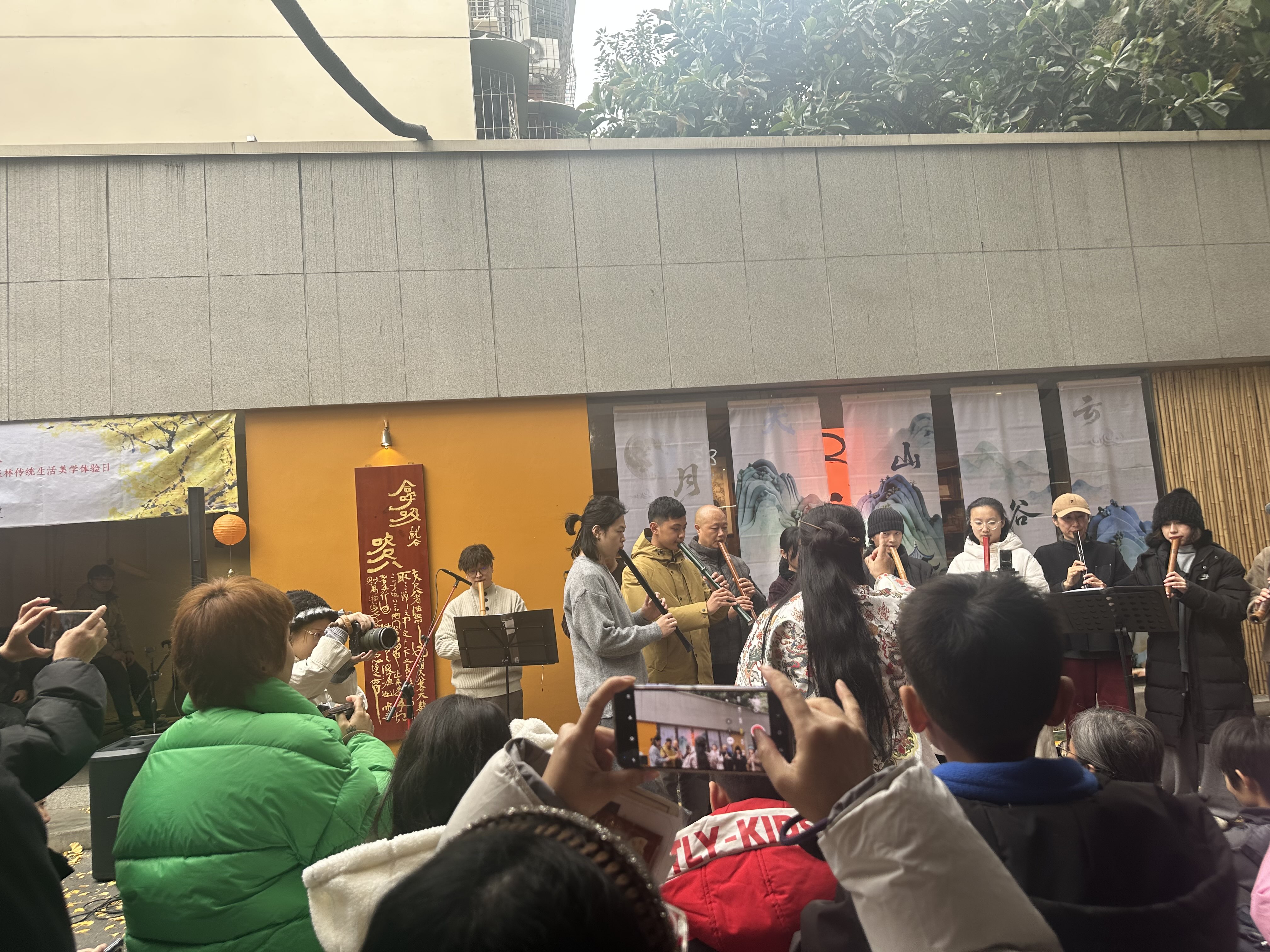 “我们下午一点多就过来了,因为住在附近,在社区群里看到消息,今天有传统文化活动,所以带着孩子来看看。”孙女士手持相机,在国家一级演奏员孙贤储带来笛子表演时,认真拍摄着。